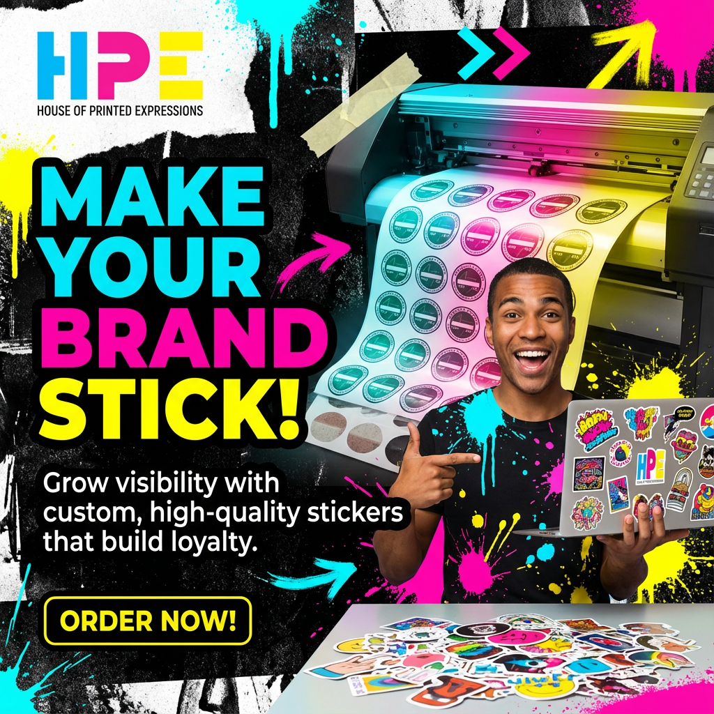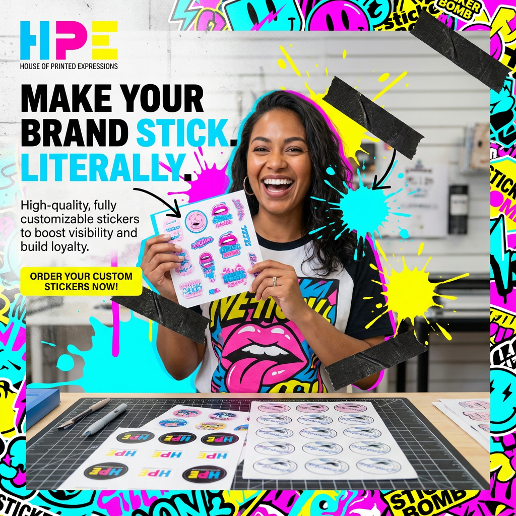 Add personality, promote your business, or bring your ideas to life with our high-quality custom stickers. Whether you're a small brand, artist, or event planner, our stickers are perfect for packaging, promotions, or just for fun.